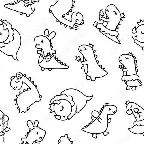 Funny cute girls dinosaurs. Seamless pattern. Coloring Page. Kawaii baby dino princess character. Hand drawn style. Vector drawing. Design ornaments.