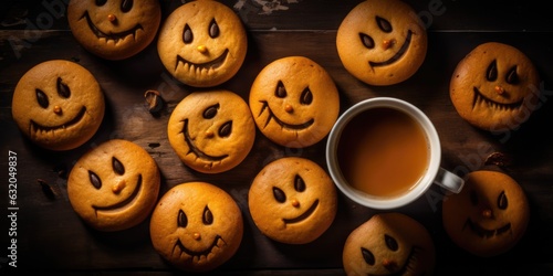 Funny delicious ginger biscuits for Halloween on the table. horizontal view from above, generative ai