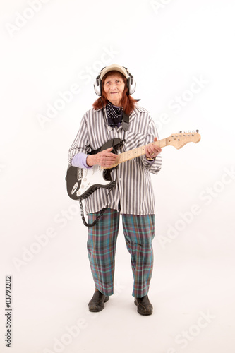 Funny elderly lady playing electric guitar.