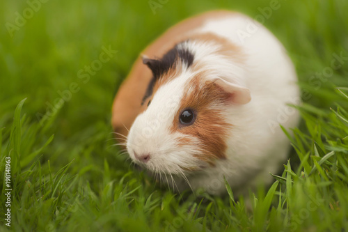 Funny guinea pig eating grass in the garden outdoors
