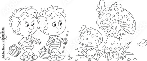 Funny little boys mushroomers with small baskets found a very large fly agaric with a spotted cap among grass in a forest glade, black and white vector cartoon illustration for a coloring book