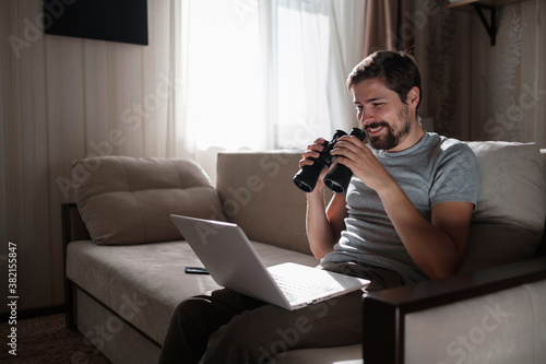 Funny man looking searching binoculars a laptop on the table working at home office.