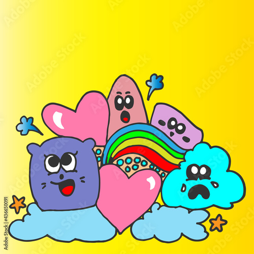 funny monster pattern on yellow background. colorful monster with eyes and mouth. cute expression. hand drawn vector. doodle art for wallpaper, cover, greeting, scrapbook, postcard, wall design.