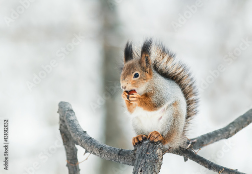 funny red squirrel sitting on a branch in the Park and eats a nut