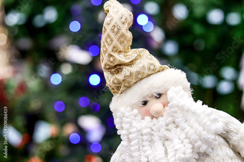 Funny Santa gnome toy with white beard on bokeh background of colorful Christmas tree lights.