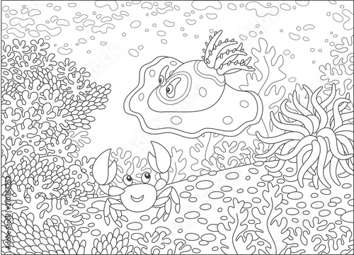 Funny sea monster mollusc and a small crab among amazing corals on a reef in a tropical sea, black and white vector illustration in a cartoon style for a coloring book