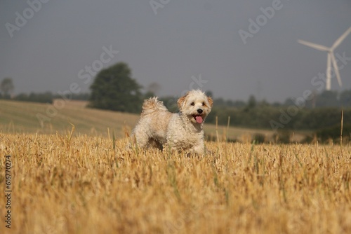 funny small brown and white havanese dog is running on a stubble field early in the morning