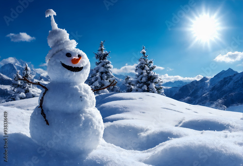Funny snowman in winter mountain scenery. Merry christmas and happy new year.