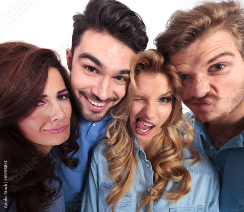 funny wide angle picture of casual people making faces