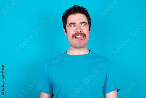 Funny young handsome Caucasian man with moustache wearing blue t-shirt against blue background makes grimace and crosses eyes plays fool has fun alone sticks out tongue.