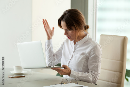 Furious mad businesswoman holding stuck laptop feels angry about bad news online, data loss or software failure, frustrated office worker has problem with pc, stressed employee hates computer crash