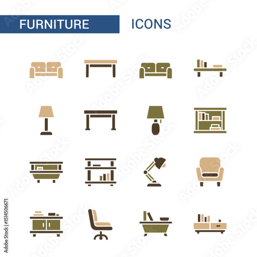Furnishing Modern Living: A comprehensive collection of meticulously designed icons, showcasing the essential elements of contemporary living, perfect for interior design and decor concepts.
