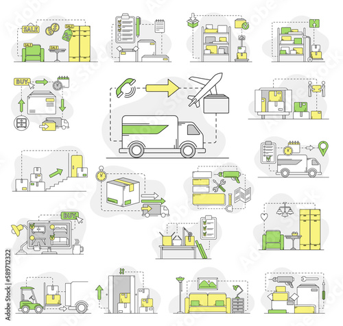Furniture Buying, Delivery and Assembling Line Big Vector Set