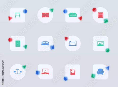 furniture glass morphism trendy style icons. furniture transparent glass color vector icon with color figures. for web and ui design, mobile apps and promo business advertising