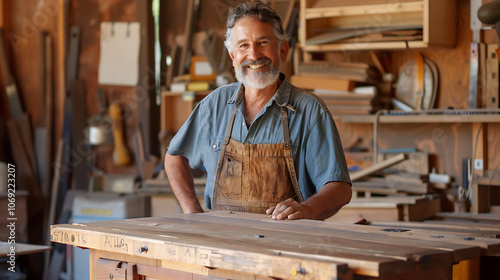furniture making, a man stands in a woodworking studio, grinning beside a completed furniture piece