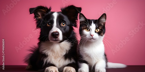 Furry friends posing side by side against vibrant pink background for photo. Concept Pet Photography, Vibrant Backdrops, Animal Portraits, Colorful Props