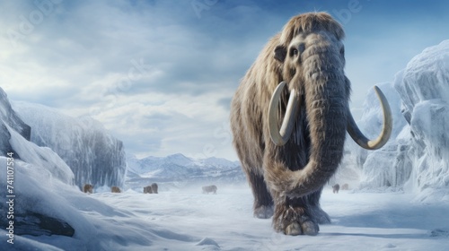 Furry mammoth migrate through icy landscape. Postproducted