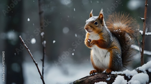 Furry squirrel with tufted ears on a snowy tree branch