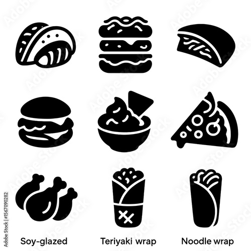 Fusion Cuisine Icons. Solid, filled icons set of cuisine fusions: sushi taco, ramen burger, kimchi quesadilla,
