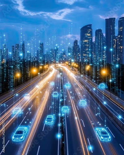 Future city AI-driven governance A futuristic cityscape with illuminated cars and digital elements showcasing smart transportation and urban design.