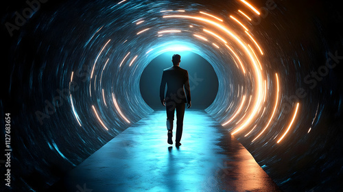 Future Forward: Man Walks Towards Bright Neon Tunnel