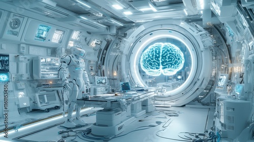 Future Medical Laboratory, a future robot, is observing a huge holographic projection brain on the operating table.