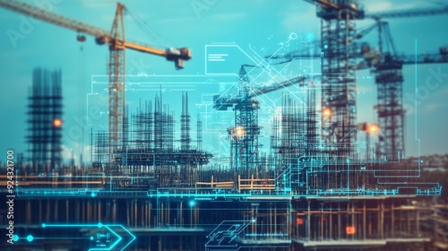 Future of Construction Technology - Industrial Circuitry and Hybrid Intelligence Control Panels at Construction Site with Cranes and Unfinished Structures Background