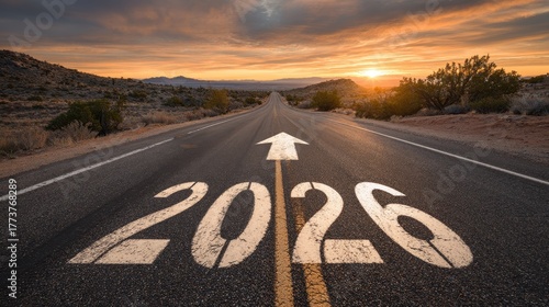 Future pathway marked with the year 2026 against a beautiful sunset landscape in the desert
