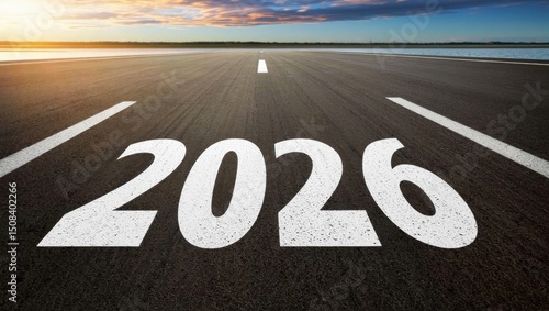 Future road marked with the year 2026 on a clear asphalt highway at sunset with expansive landscape in the background