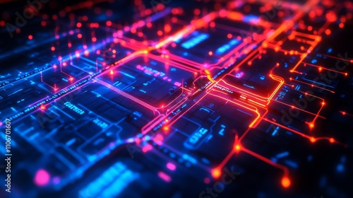 Future style subway map with glowing deep blue and red light, black background, and super realistic 3D rendering effect. Display high-definition resolution, deep tones, and high dynamic range details.
