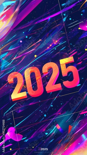 Futuristic 2025 Abstract Background. Dynamic Geometric Shapes with Neon Colors and Light Effects