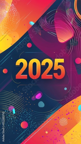 Futuristic 2025 Abstract Background. Dynamic Geometric Shapes with Neon Colors and Light Effects