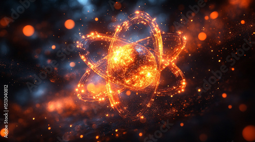 Futuristic 3D abstract atom with glowing lines and points, symbolizing nuclear energy, AI, and advanced technology. Modern innovation, automation, and future science concept.