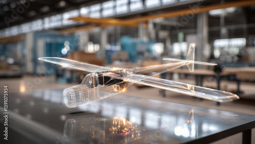 Futuristic 3D model design of an airplane in a modern workshop setting.
