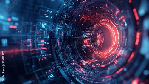 Futuristic abstract illustration of a digital vortex with glowing blue and red elements at night