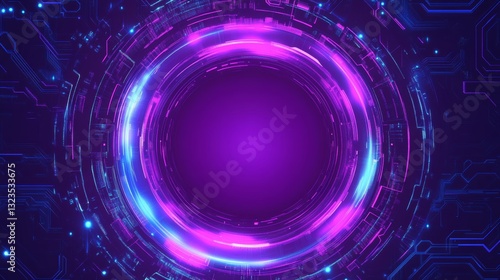 Futuristic abstract technology background with glowing circuit board lines and round frame. High-tech digital design in blue and purple tones, perfect for innovation, AI, and cyber concepts.