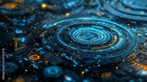 Futuristic abstract technology background with glowing circular patterns and intricate circuitry in vibrant blue and orange tones