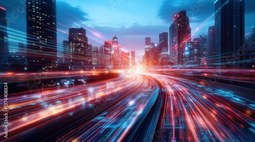 Futuristic aerial view of urban traffic nighttime skyline in long exposure