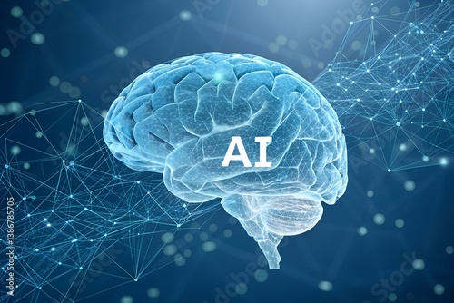 Futuristic AI Brain Wireframe with Digital Circuit Network on Dark Blue Background