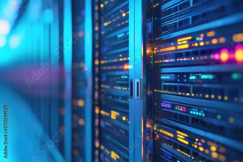 Futuristic AI data center with vibrant blue and orange illuminated servers, ideal for IT infrastructure visuals, cloud computing, and advanced technology presentations