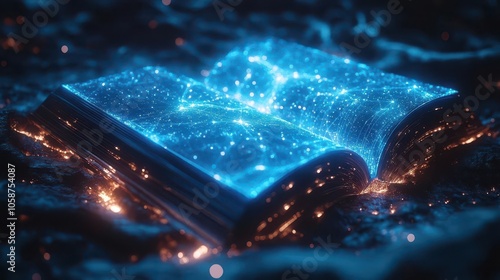 futuristic ai generating an ebook amidst a web of glowing interconnected lines and digital points, showcasing innovation and creativity in a sleek blue environment