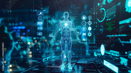 Futuristic AI medical hologram with digital human anatomy and advanced healthcare technology interface