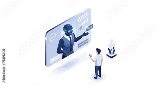 Futuristic AI Mentor Guiding User Through Digital Interface with Data Visualization