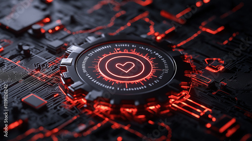 futuristic AI powered tool with glowing heart symbol, set against dark circuit board background, evokes sense of innovation and connection