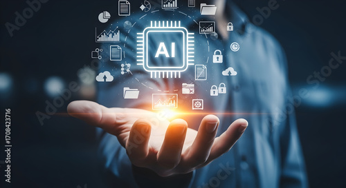 Futuristic AI Technology Concept Image Showing Hand Holding Digital AI Icons and Cloud Data Symbols for Innovation and Digital Transformation