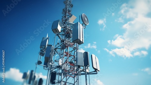 Futuristic and technologically advanced cell tower with high tech signal transmitters and antennas set against a clear blue sky backdrop