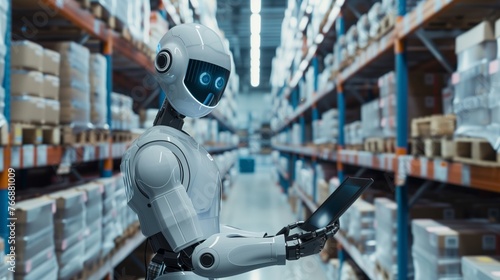 Futuristic android robot navigating and working with tablet in modern warehouse, concept of roboticized warehouses. Advanced robotics and automation in inventory management.