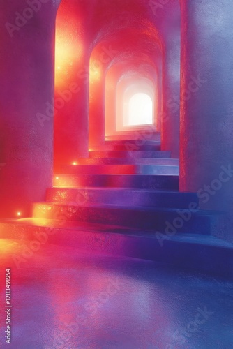 Futuristic arched staircase illuminated by surreal glowing lights in red, blue, and purple, creating an abstract and dreamlike interior space.