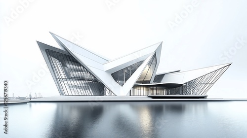 Futuristic Architectural Marvel with sharp angles and reflective water showcasing modern design