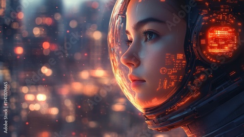 Futuristic astronaut girl, city lights, glowing helmet.